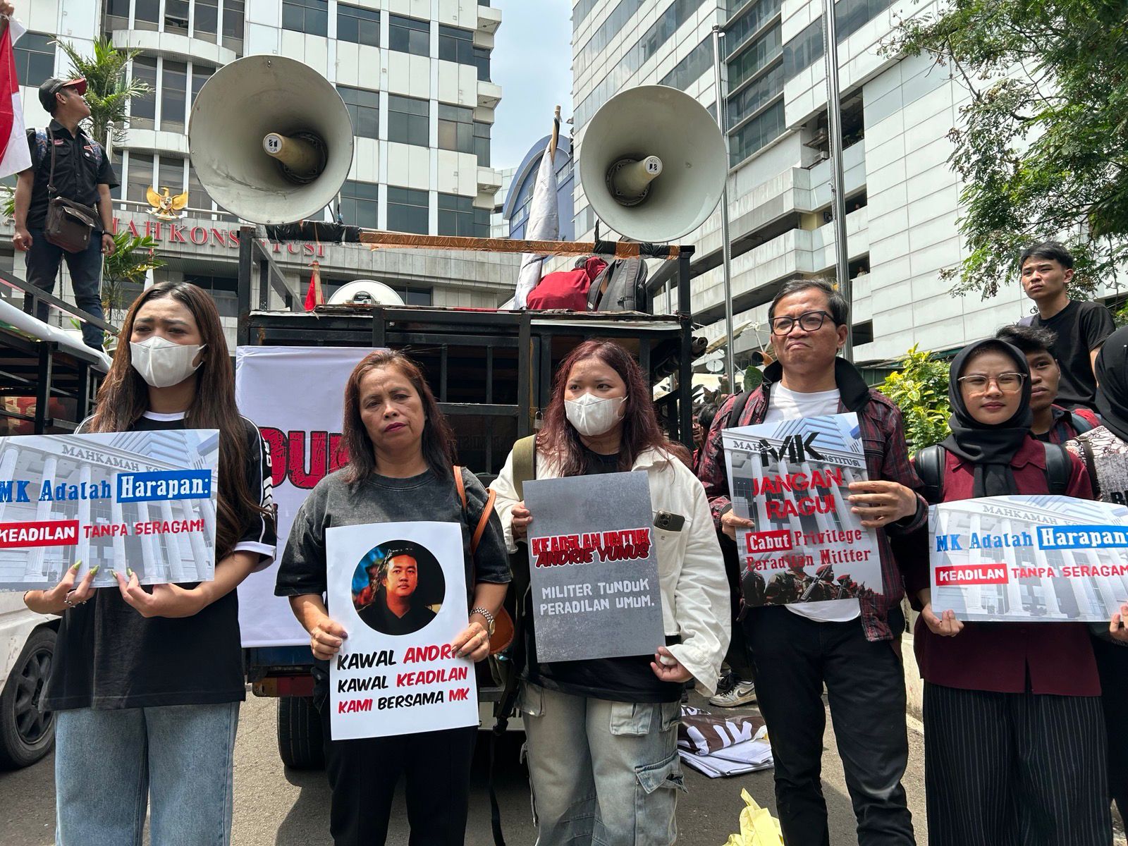 Aksi solidaritas tersebut digelar di depan Gedung Mahkamah Konstitusi (MK), Jakarta, bertepatan dengan sidang Judicial Review Undang-Undang TNI dan Undang-Undang Peradilan Militer di
